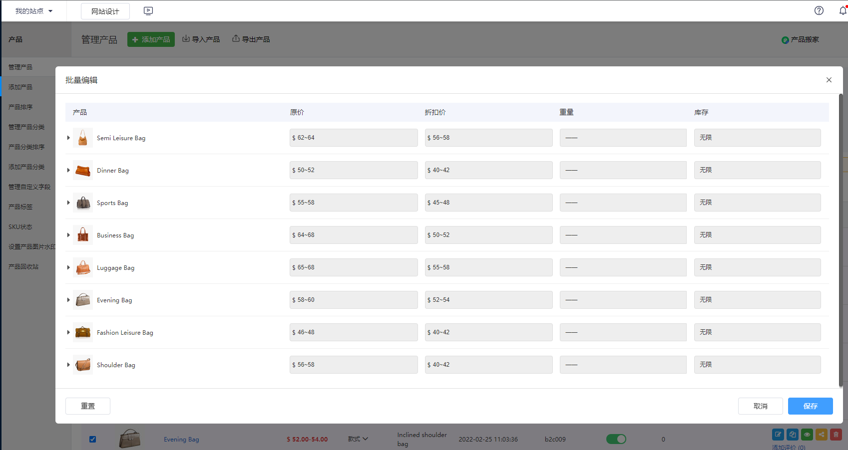 发布功能:产品管理新增“更多属性批量编辑”按钮,在“批量编辑”弹窗中支持对产品的原价、折扣价、库存和重量等属性进行批量设置。
